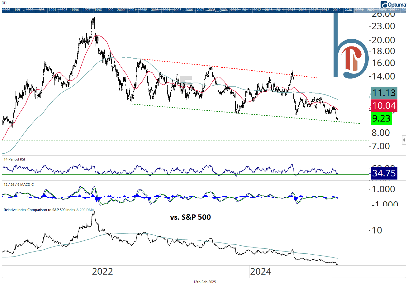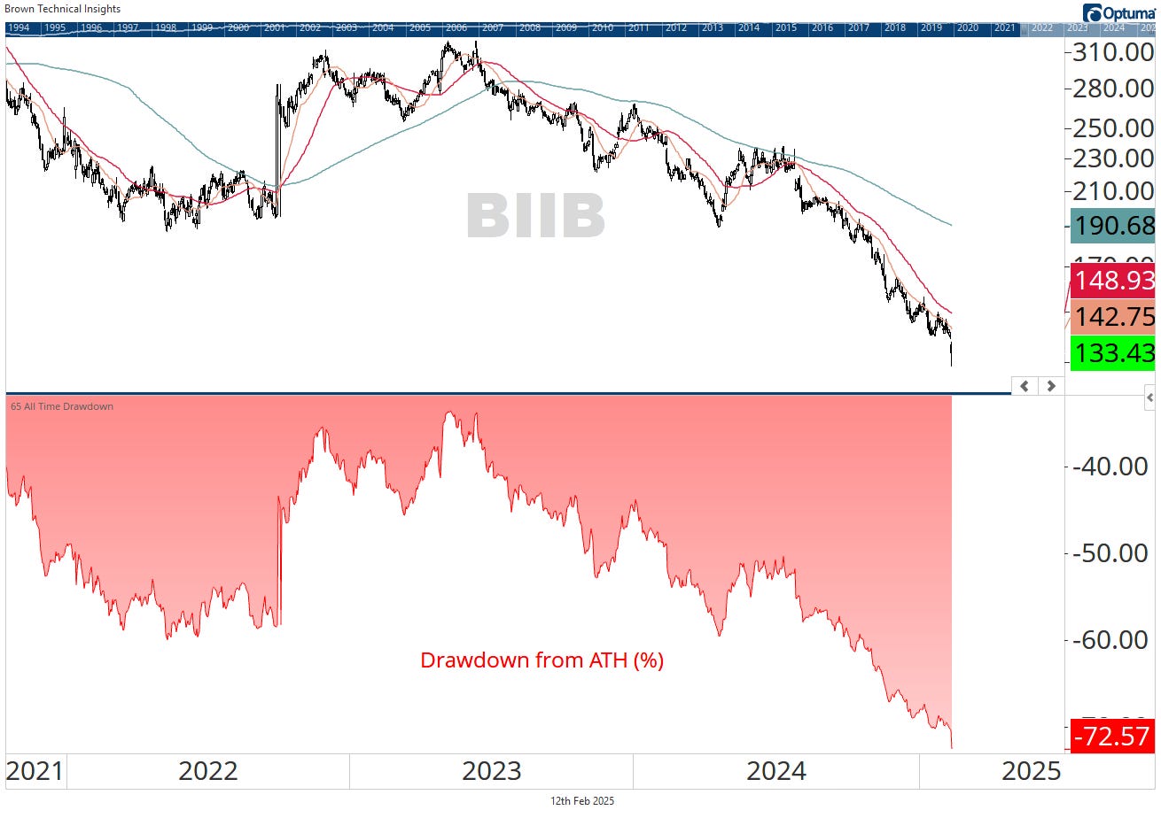 BIIB was once one of the world’s largest biotech companies but its precipitous decline continues. The stock made another 10-year low yesterday after reporting earnings.