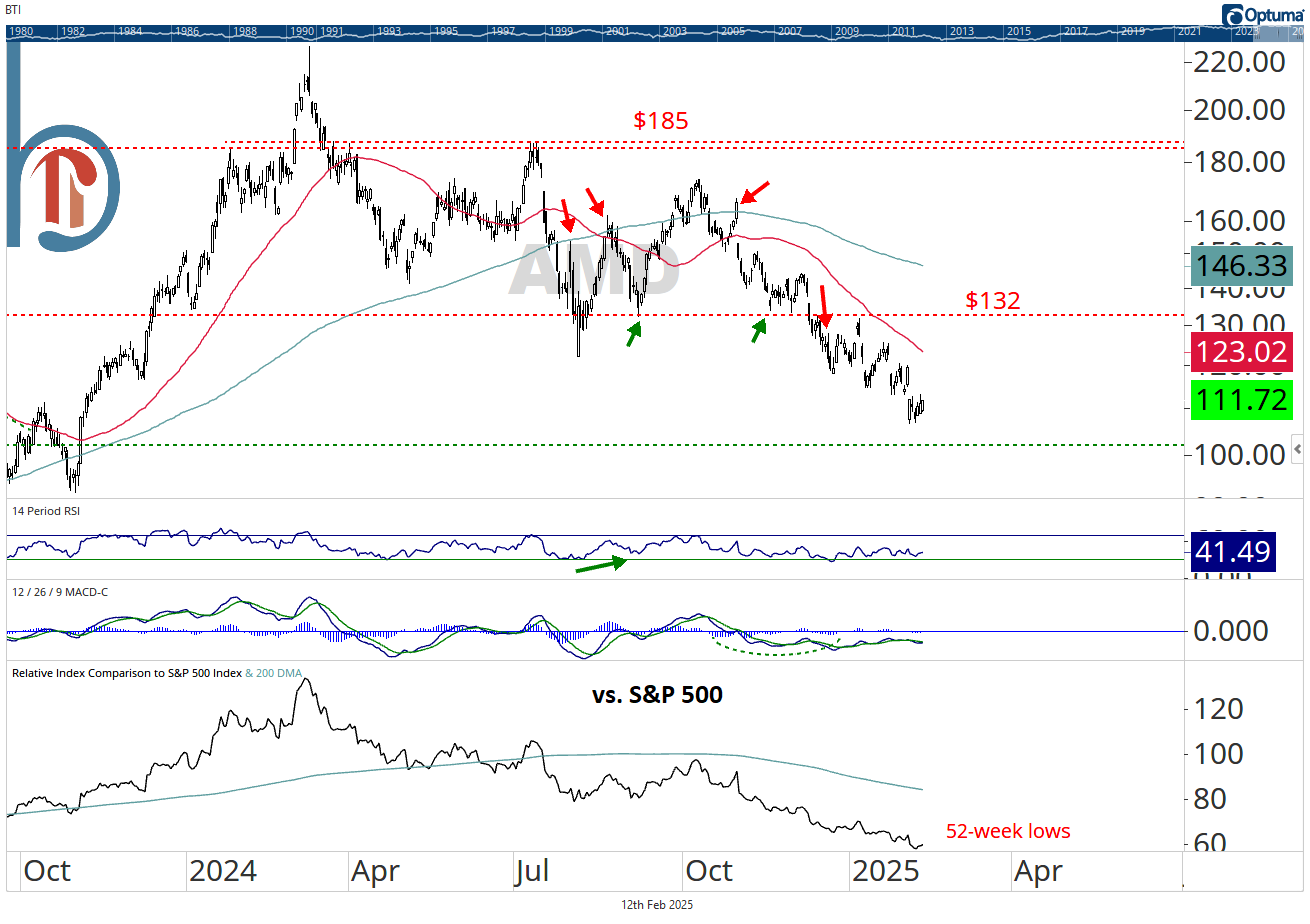 Everybody (including me) keeps looking for AMD to bottom and it keeps not happening. There’s some support just above $100/share but as long as the 50-day looks like this, just forget the stock exists. More on semiconductors later.
