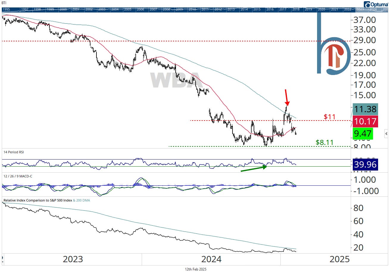 Sometimes when the Dow committee throws out a stock, it’s a contrarian indicator. Sometimes it’s because the stock is a future zero. WBA had a nice base and breakout but that rarely matters when the 200-DMA is downward-sloping. That’s why we wait for the trend to turn.