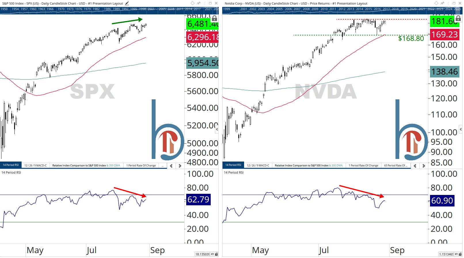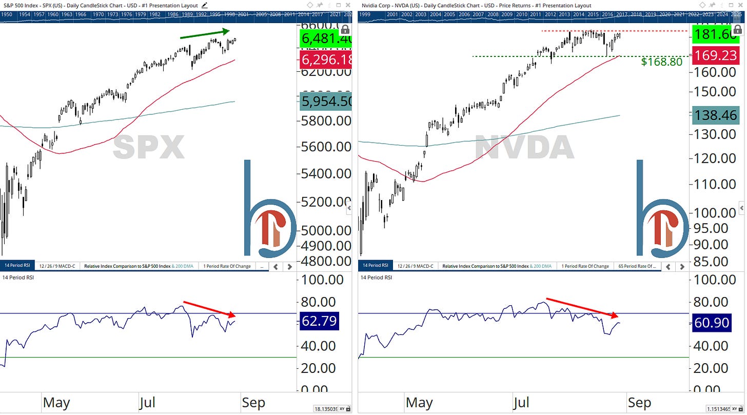 If you look over to the S&P 500, you can see the potential impact (note the comparable bearish momentum divergences). Like our reader on Tuesday noted, the index is more vulnerable to what happens with Nvidia, even if the rest of the market is rocking and rolling.