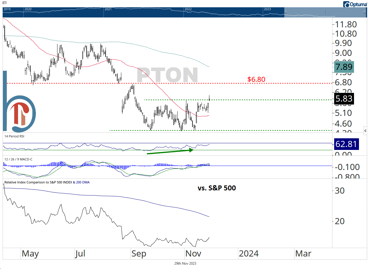 You know the rally is broadening if Peloton is trying to get in on the action. The stock broke out to a 2-month high yesterday and the base measures to $7.22. Resistance at $6.80 makes that a more reasonable short-term target.