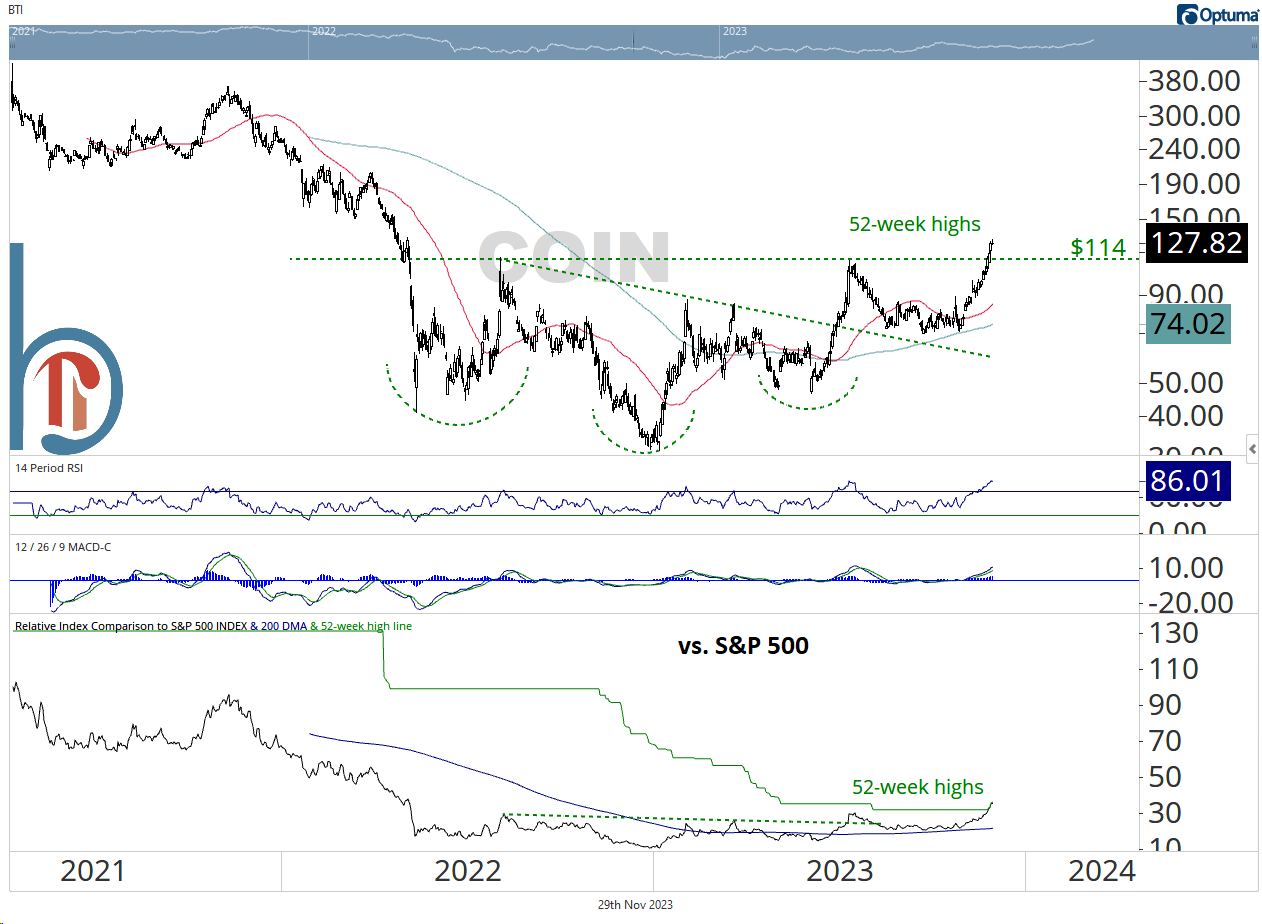 This isn’t the first time we’ve seen the high-flyers start to party again. I called out COIN breaking out in early July, just before it exploded higher by 25% in one day. After pulling back to the diagonal neckline and a rising 200-DMA, Coinbase has gathered momentum again and broken out to 52-week highs. The $114 level can be used to manage risk.