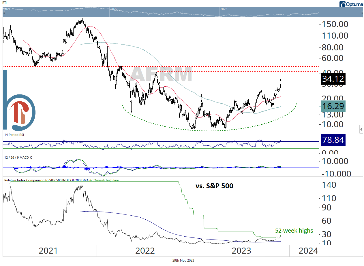 Affirm is up 93% just in the month of November, but if you just look at the chart, there could be more to go. The base measures to $37 (about 10% more upside) but there is little to call resistance until you get to the mid-$40s.