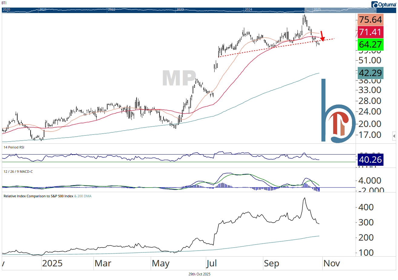 MP has broken an uptrend line that stretches back to July and the recent all-time highs came with bearish RSI-14 and MACD divergences. This stock has had an insane run, but the near-term trend has turned against it.