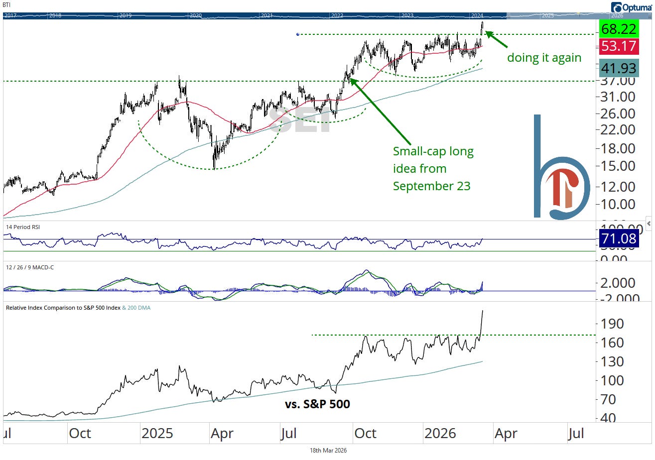 Featured at $40 back in September, SEI is breaking out of nearly the exact same setup again. The measured target off this base is $80, suggesting more upside, despite the ~30% gain in the past three days.