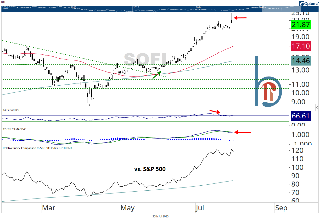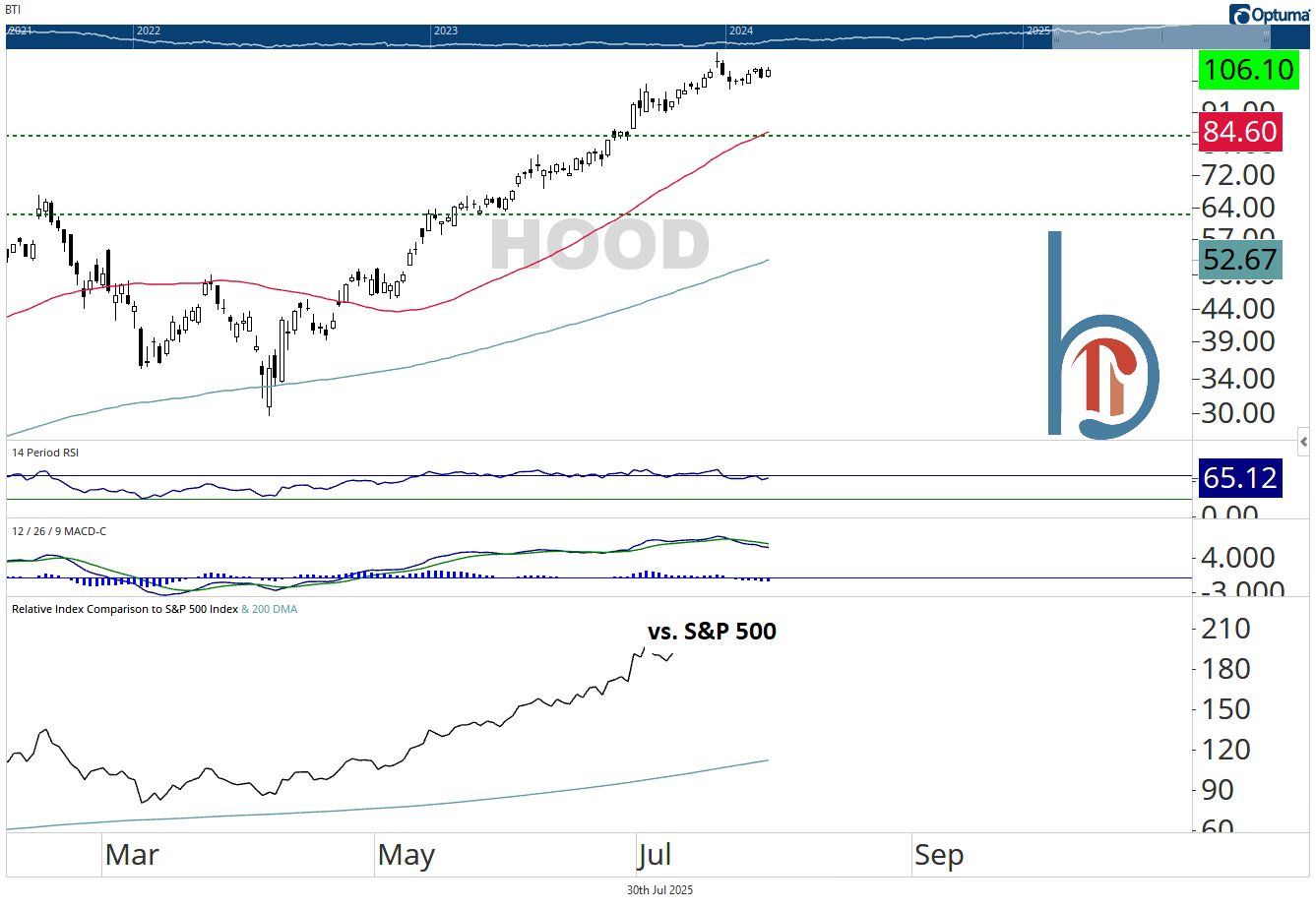 RobinHood shares were virtually unchanged following its earnings call last night. The stock had a huge run into the report, so not breaking down bodes well for future gains; however, the July 18 highs at $113 remain a potential near-term top and tactical resistance level.