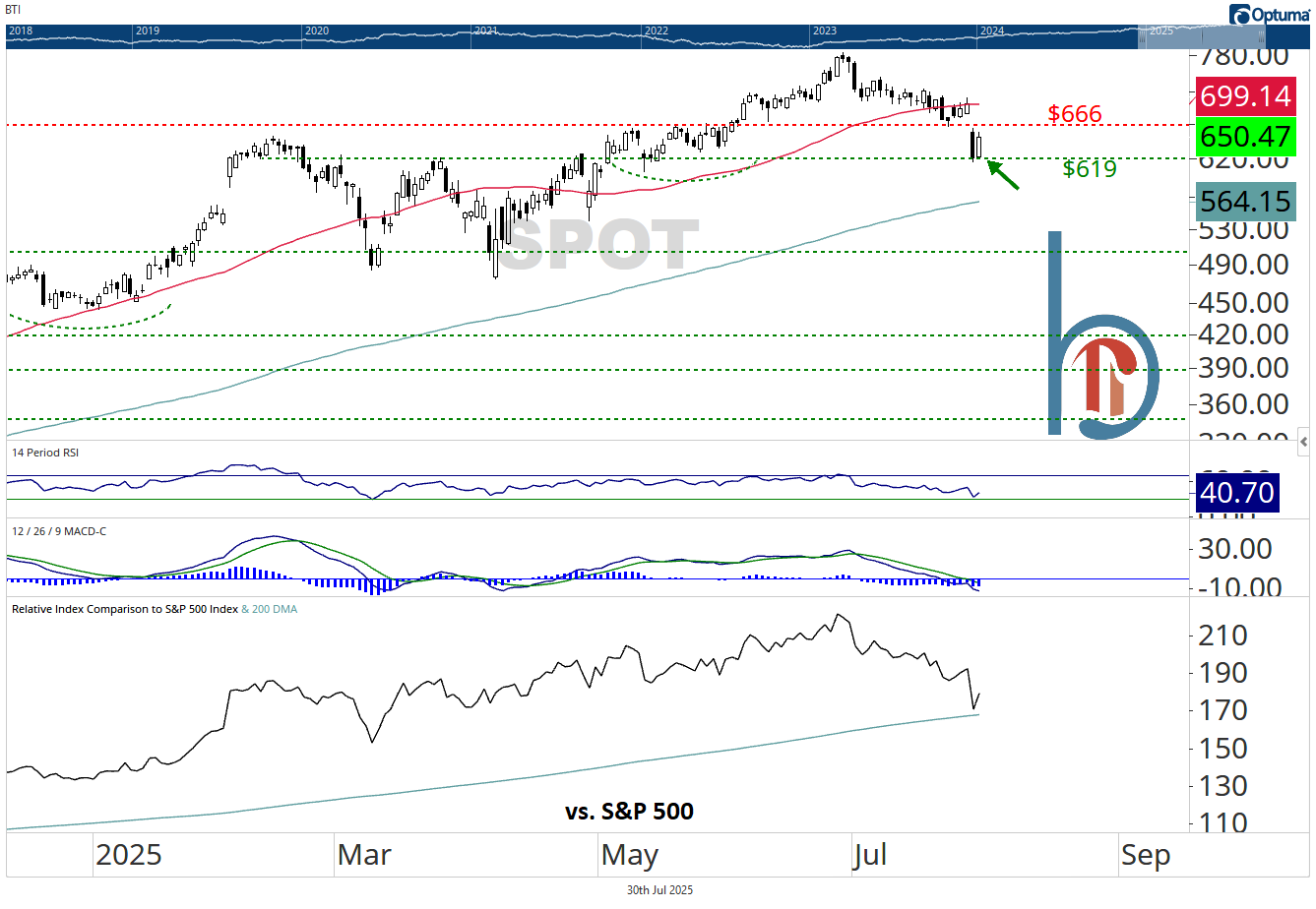 Spotify broke support and hit its lowest level since May on Tuesday following earnings, but bounced back with a 4.9% gain yesterday. Tactically, the stock needs to reclaim $666, but the long-term trend here deserves the benefit of the doubt.