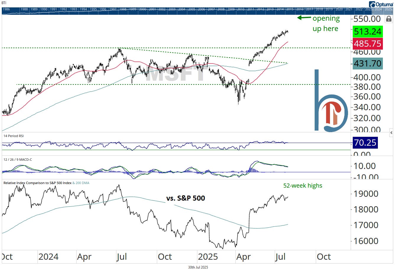 At the conclusion of its earnings call, Microsoft shares were higher by more than 8%, trading around $555. The company was already on a huge run, there’s little else to add technically except for: Hold on.