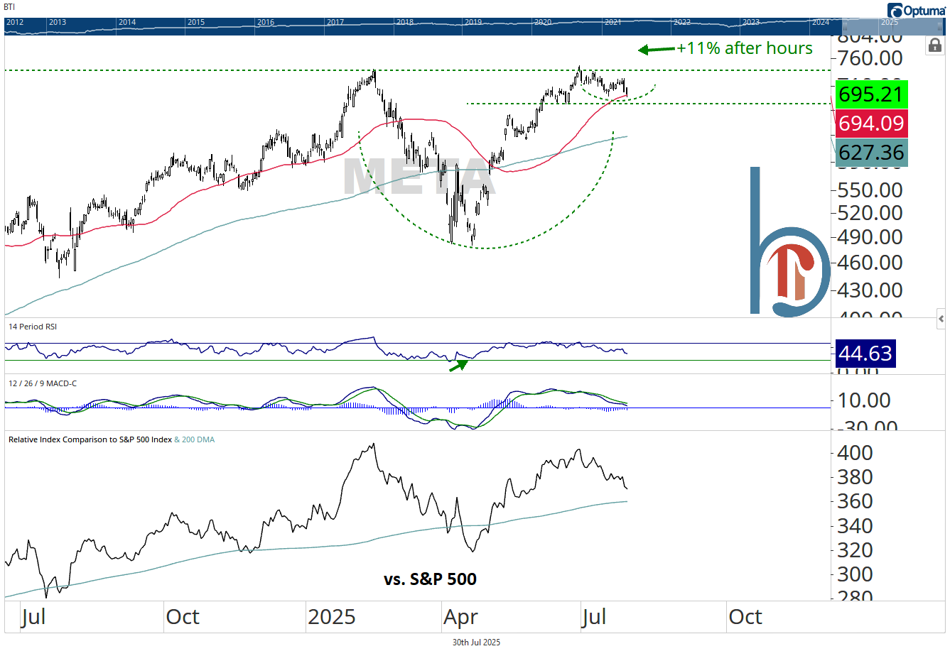 Monday’s Playbook highlighted the potential cup and handle pattern in META and safe to say… it was a handle. The stock is up more than 11%, near $776 premarket, obviously completing a major base breakout. The measured target? $978…