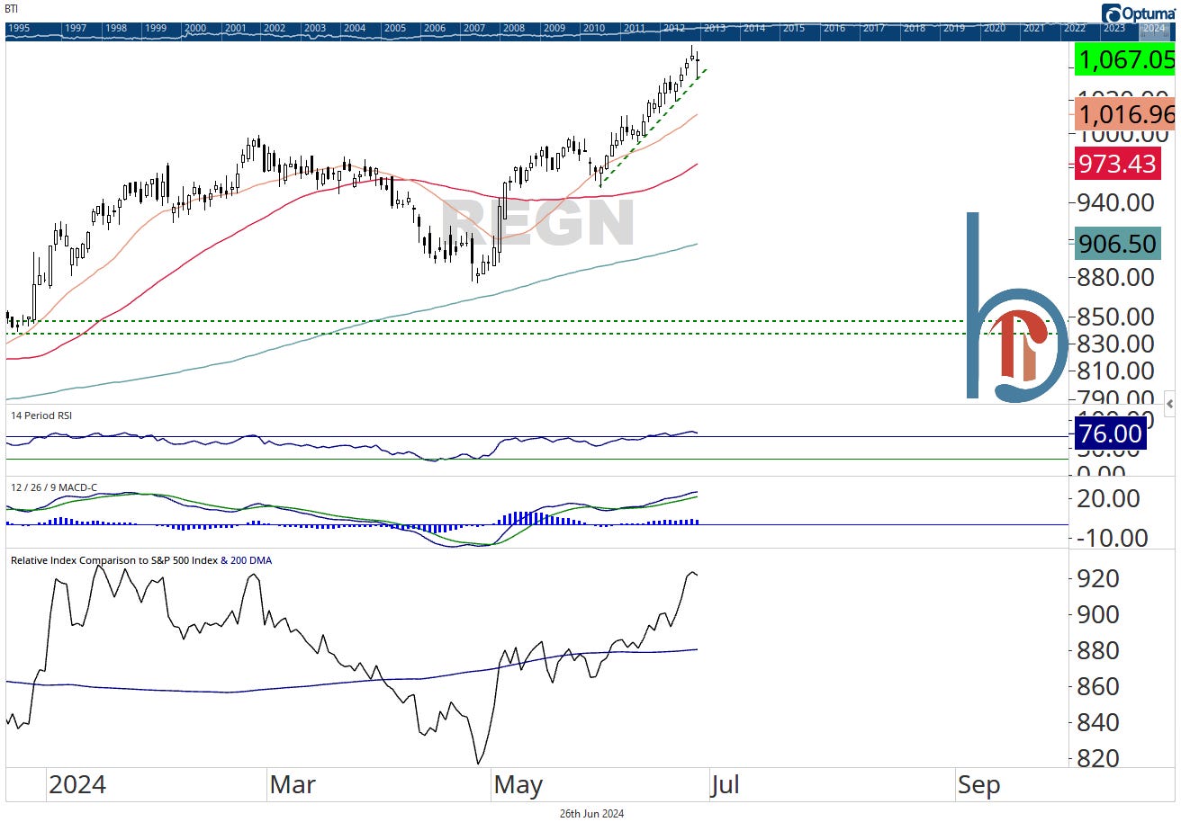 REGN hit a 52-week high on Tuesday and bounced off the bottom of a month-long uptrend channel yesterday.