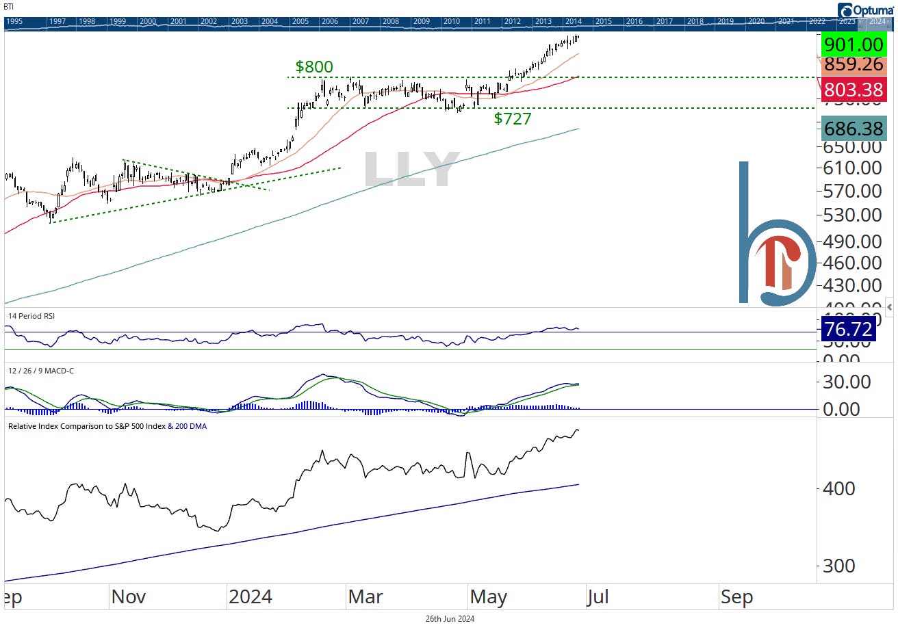 Eli Lilly has already hit the measured target from its base and the MACD is cresting but this stock remains a leader in a strong uptrend. Pullbacks and pauses should be bought until that changes.