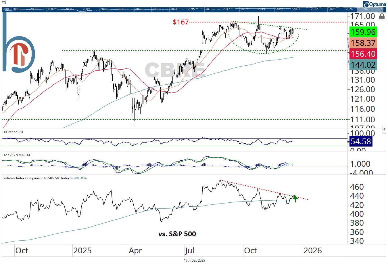CBRE Group has some nice base-on-base action and is pushing up against a 3-month downtrend line. A horizontal breakout above $167 targets $186.