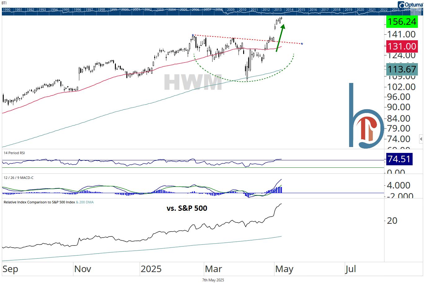 HWM was featured two weeks ago in our aerospace and defense focus, and the stock is up 20% since. Now the most overbought since its February consolidation began, this is a top stock to watch for an opportunity on a pullback.