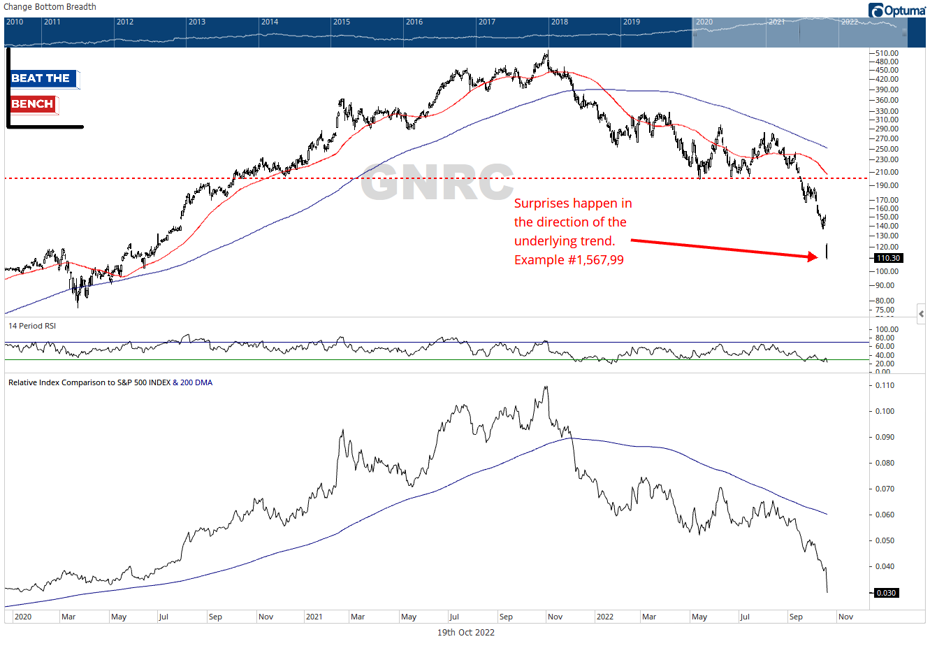 They say surprises happen in the direction of the underlying trend. For Generac that trend has been down for months. GNRC was featured in the very first edition of this report and I called it a short when it was trading at $175. GNRC fell 25% yesterday and is down 36% since that report.