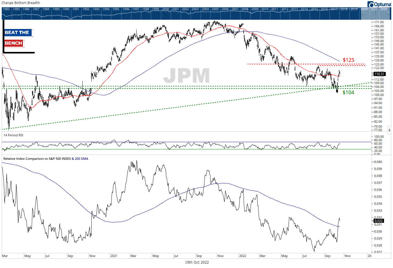 A response at $104 is what investors needed to see from JPMorgan and a response at $104 is what they got. However, the risk/reward here looks pretty poor, as the stock has yet to make a higher high and there is a cluster of resistance near $125.