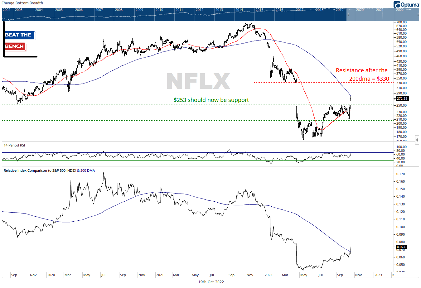 Netflix popped 13% yesterday following their Tuesday earnings report. The stock cleared resistance at $253, which should now be viewed as support. It will have to battle a downward sloping 200-dma, but filling the gap near $330 is now a possibility.