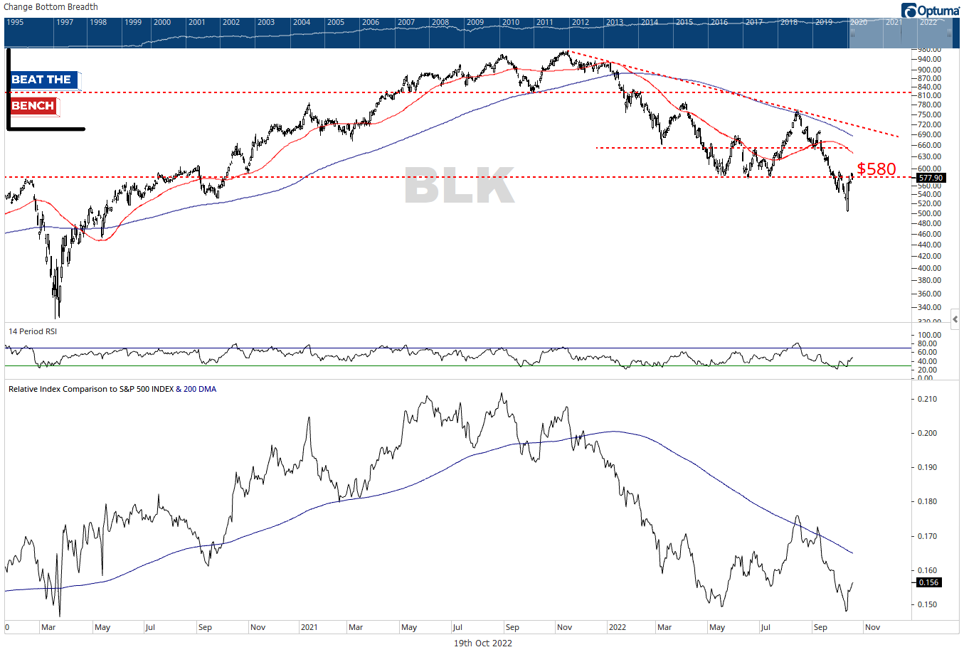 Few stocks had as big of an intraday reversal last Thursday as BlackRock. It has managed to hold those gains post-earnings report but is having more trouble reclaiming its summer lows. Negative bias.