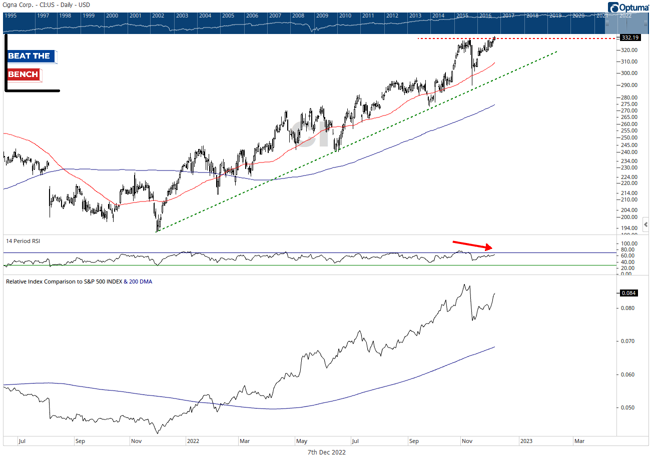 Cigna has been a staircase up for more than a year, so this isn’t a stock to bet against. However, RSI-14 momentum is negatively diverging as it tries to break through its November highs, heightening the risk of a near-term pullback. The green uptrend line needs to stay intact if you are long, but pullbacks to it should be a chance to add.