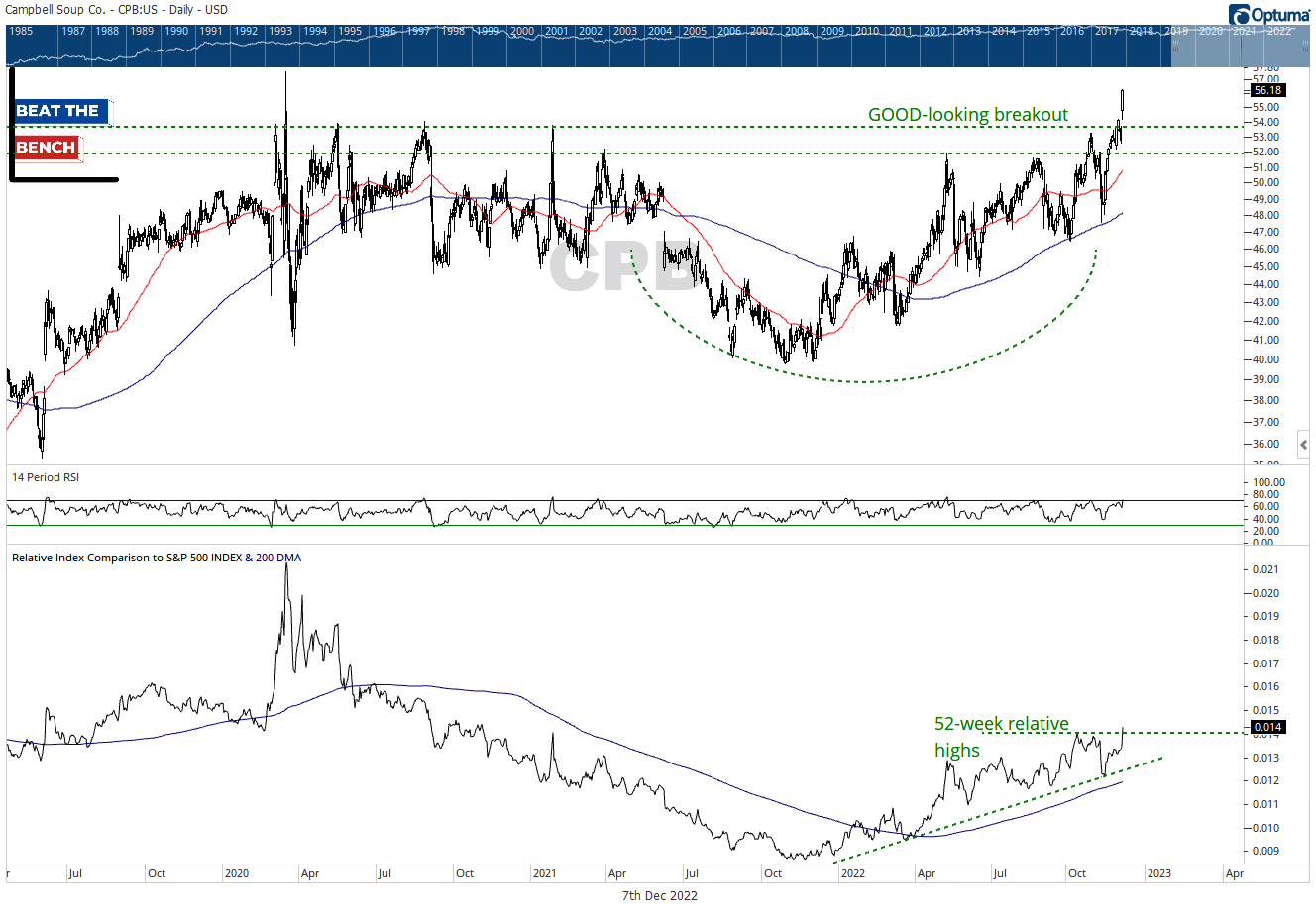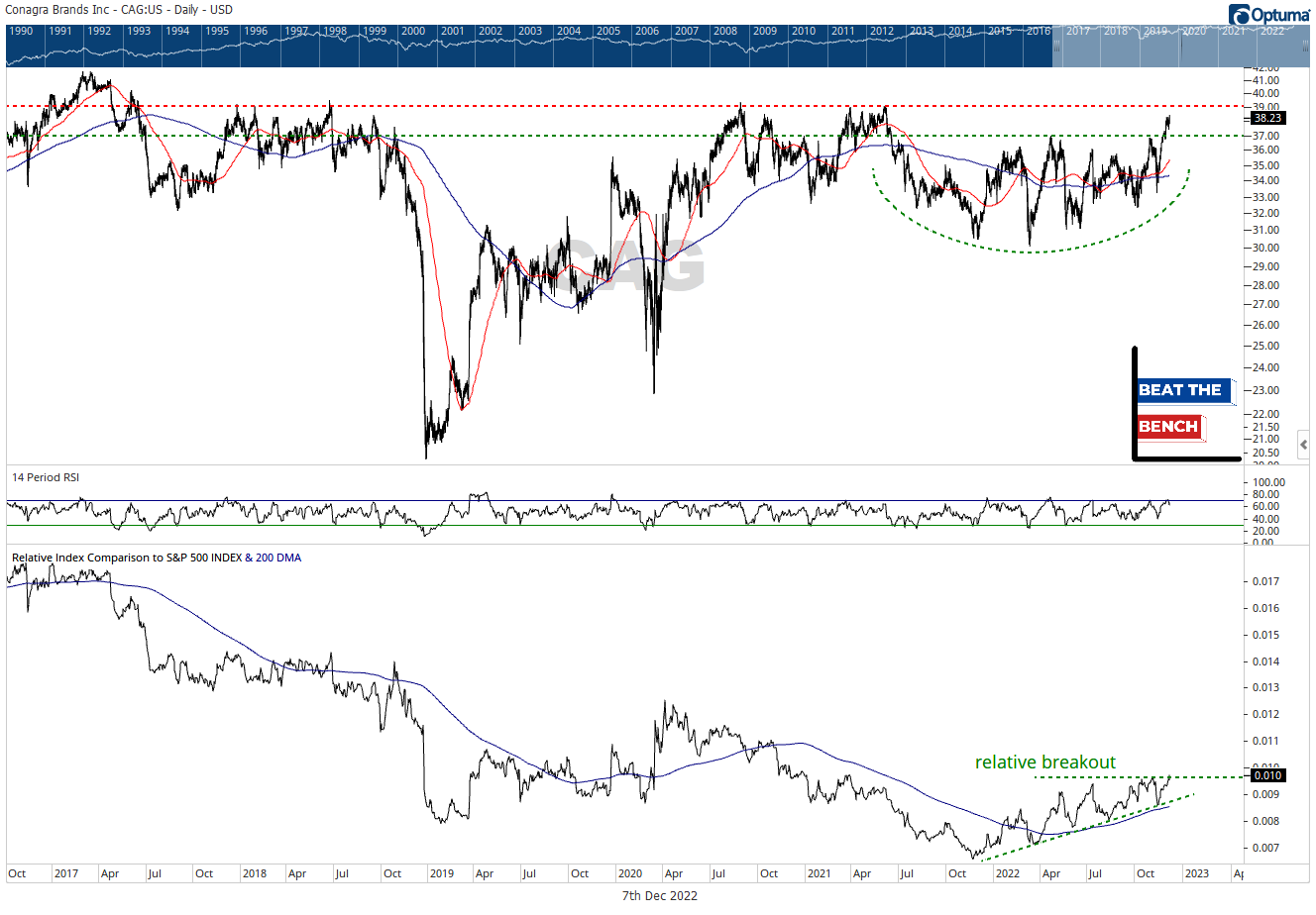 Conagra is first up on our list and its 52-week high also comes with a breakout on the relative chart. Don’t get too bulled up though. While this is nice breakout from an 18-month base, $39 has capped this stock no less than six times going back to 2017, so we need to see it prove it can make it through that historical overhead supply.