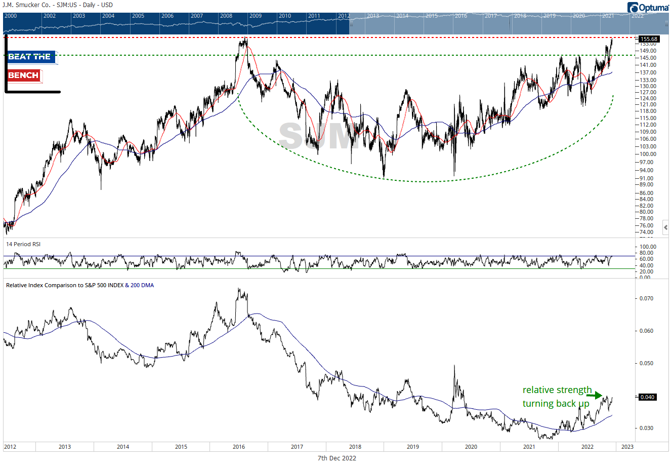SJM has arguably already broken out of this giant base but needs to clear the $157 level to fully complete the picture with an all-time highs. Relative strength is accelerating again above a rising 200-dma and this looks like a timely long.