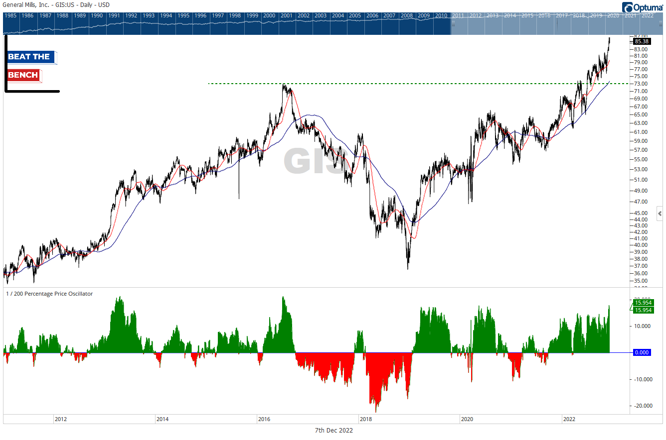 General Mills has been as strong of a stock as you can find outside energy this year and is staying consistently overbought. Currently at 16% above its 200-dma, this is pushing the upper bound of what it has been able to achieve over the past decade, but this is a relative leader that looks buyable on pauses and pullbacks.