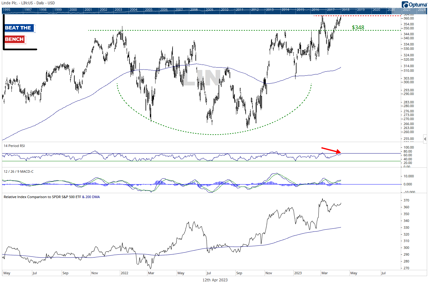 Linde hit a new intraday high but has failed to make a new closing high. I don’t like to quibble too much with 52-week highs, but there is also a clear bearish momentum divergence that bears watching.