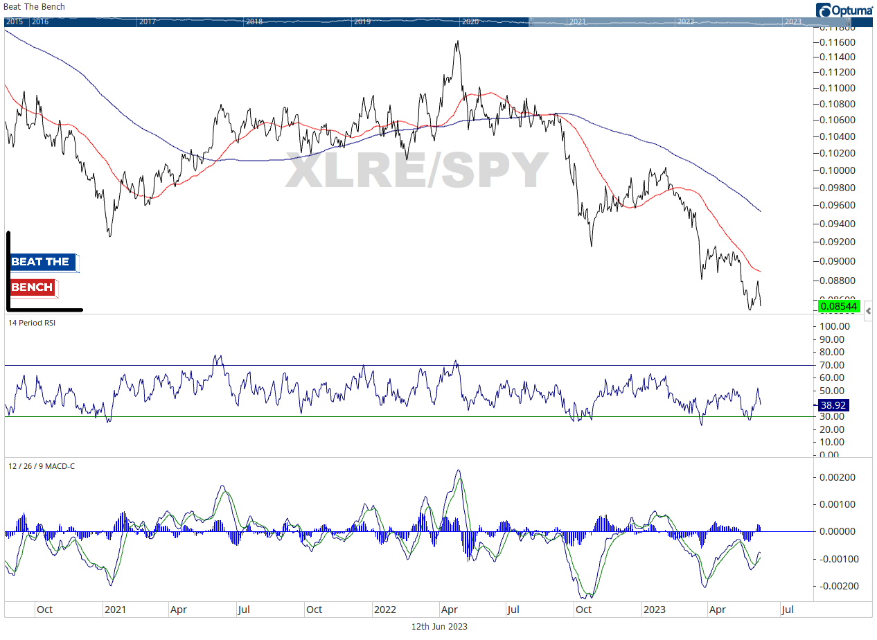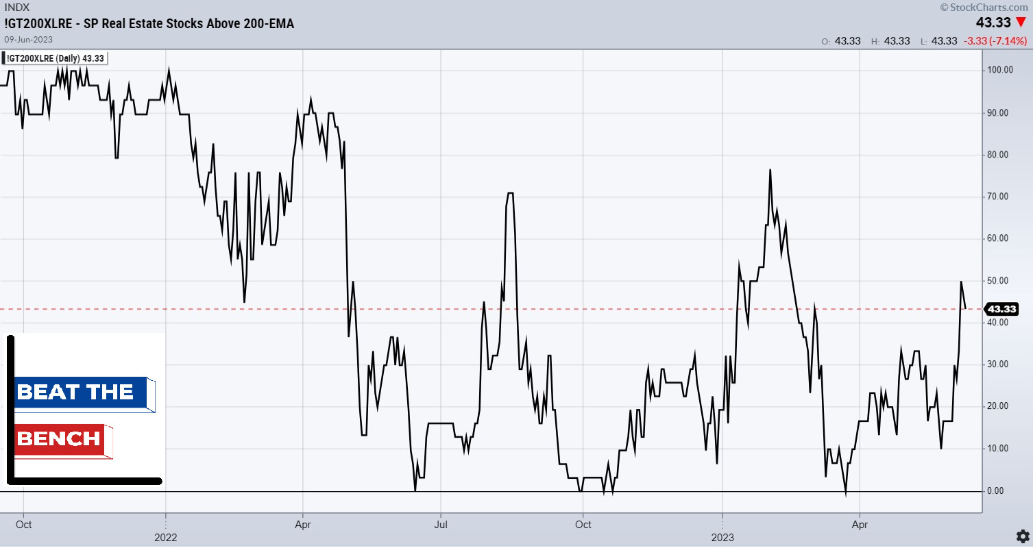 Just 43% of real estate stocks are above their 200-day exponential moving average. This is weaker than the broad index’s reading (53%) and the 4th worst reading of any sector, with only utilities, healthcare, and materials showing weaker readings. It doesn’t mean the sector can’t go up but does mean the opportunities for stock pickers are more limited.