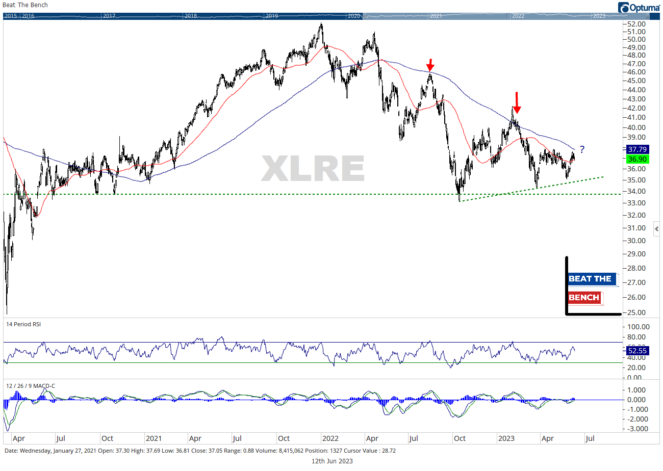 Real estate is actually lower since the last report but is holding an uptrend line that stretches back to the October lows. It looks as though the summer 2020 lows are going to hold as support for real estate, but the 200-DMA is still acting as resistance up above.