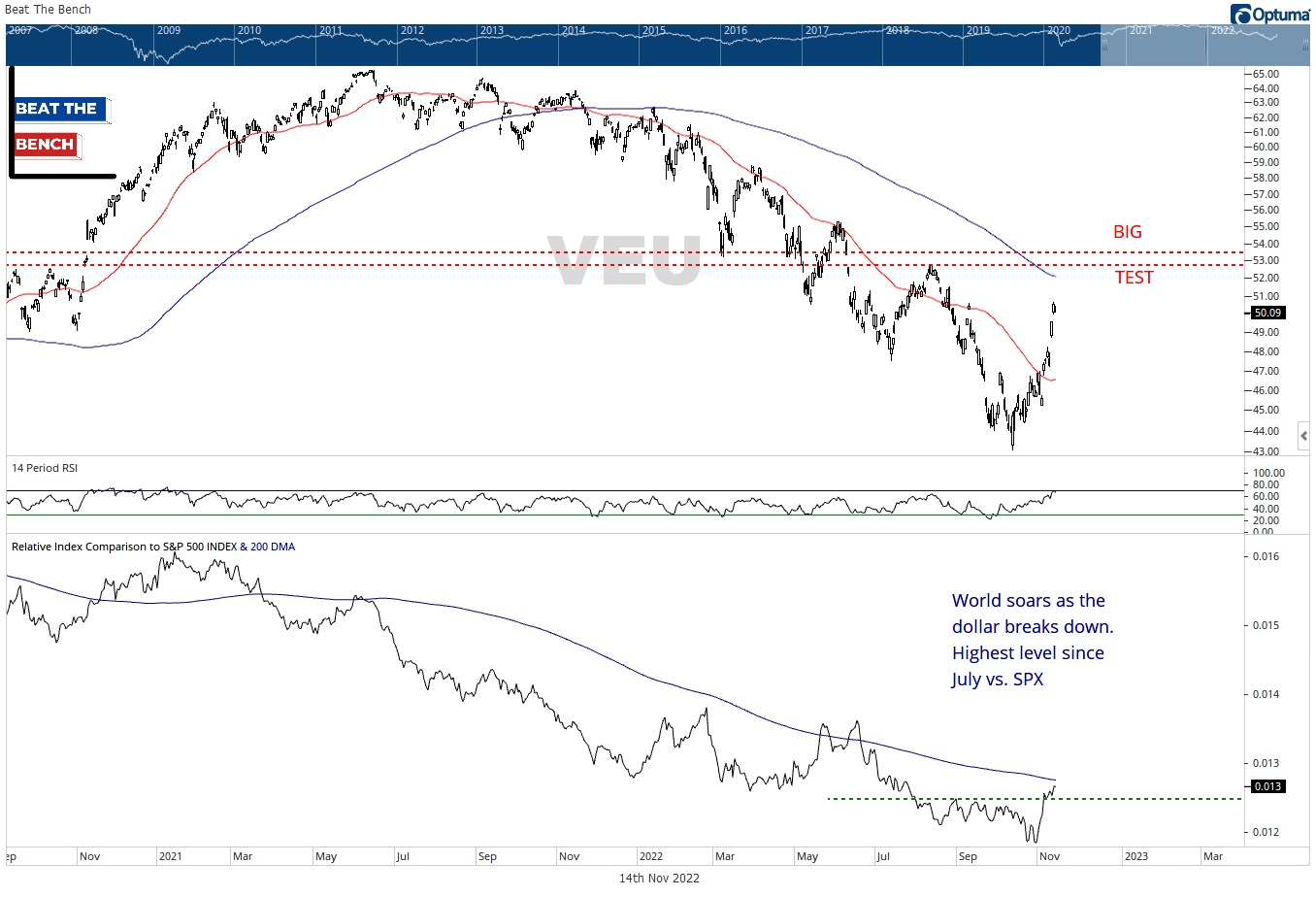 Foreign stocks, as measured by the MSCI World ex-US ETF, hitting 3-month relative highs vs. the S&P 500
