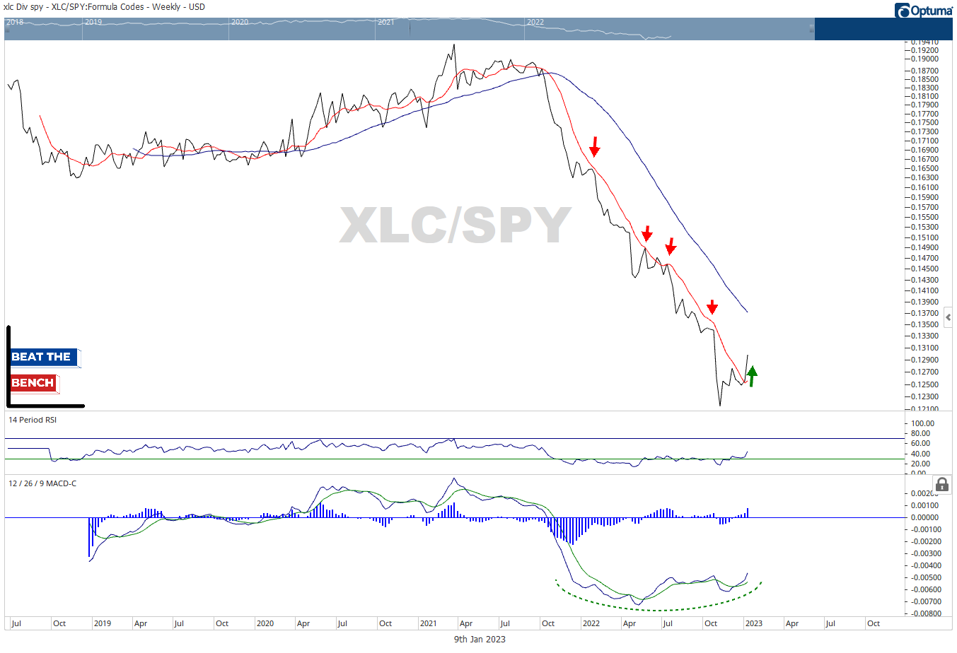 Obviously, when you’re the worst performer in 2022, you aren’t going to have a great relative chart. So of course, the XLC:SPY ratio is far from an uptrend. But there are notable signs of life. The ratio has recently broken through its 10-week moving average, which acted as resistance all the way down, and the weekly MACD has been turning up higher from extreme oversold conditions for months.