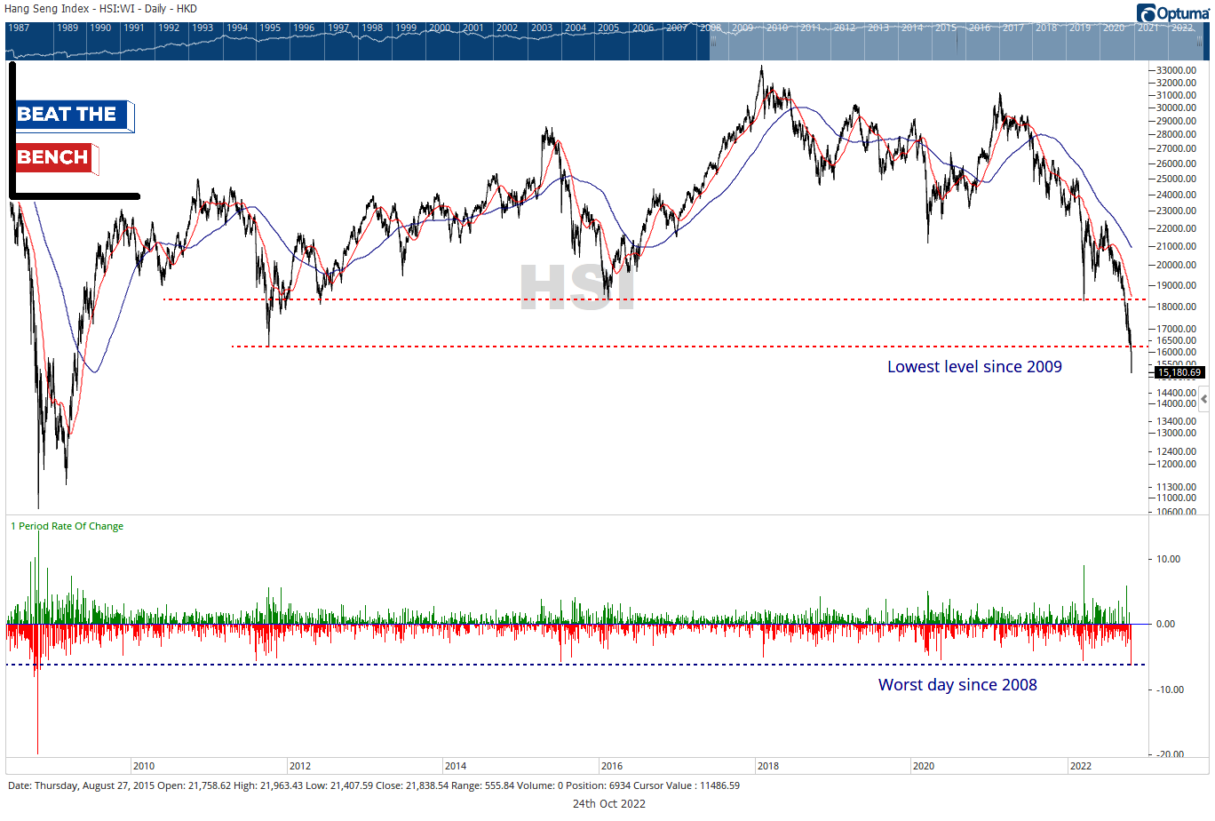 The Hang Seng plunged 6.4% on Monday, reaching its lowest level since the depths of the financial crisis. There is little to call support between current levels and the GFC lows. Any rallies back to 16,200 are sells.