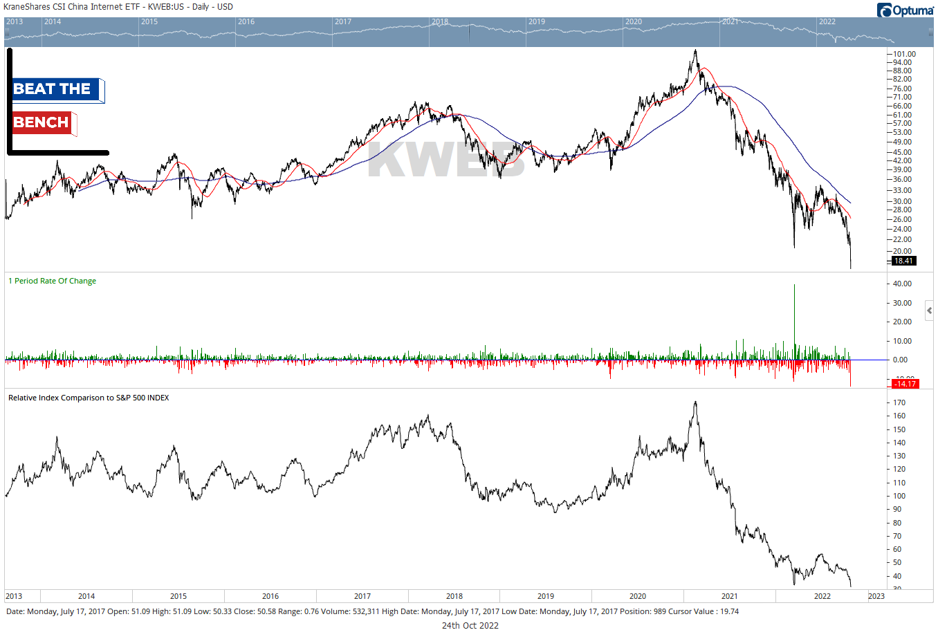 Monday was a historic day for KWEB. Not only did it suffer its worst ever decline (-14%), but it traded to an all-time low in price.