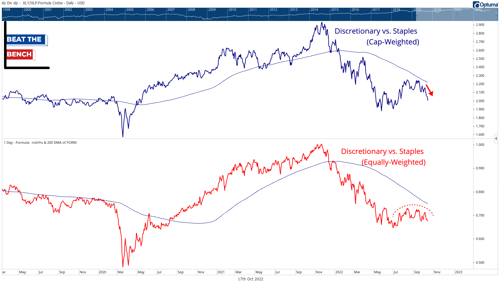 The first edition of The Monday Morning Playbook had fortuitous timing, as September 19 marked the most recent top in this ratio. Staples have outperformed discretionary by 6.8% since.