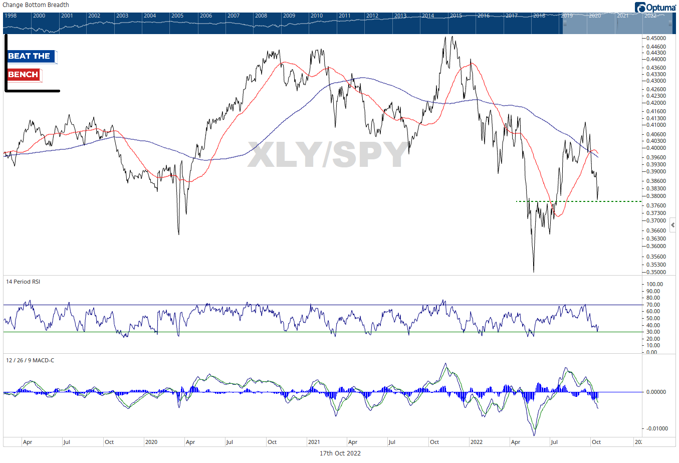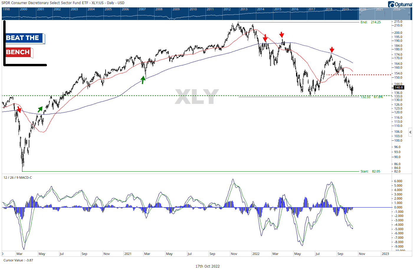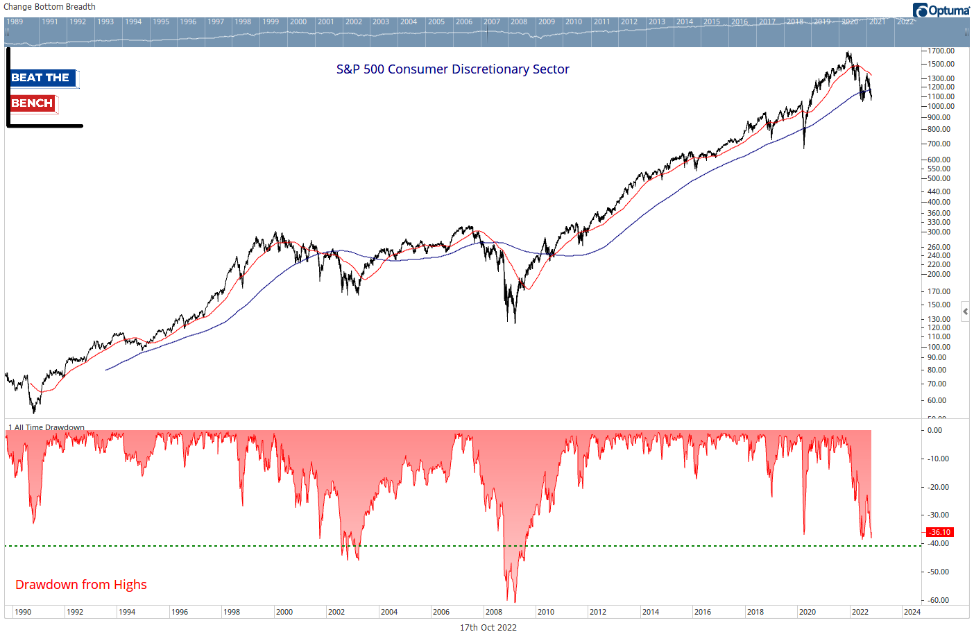 This week, I’m tackling the consumer discretionary sector. Jamie Dimon may or may not be right about the state of the US consumer, but don’t tell consumer discretionary stocks. CD is the second worst performing sector over the past year (-27.22%) and is a sector that the Beat the Bench Sector Allocation remains firmly underweight.