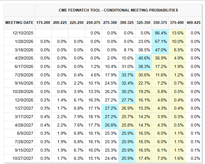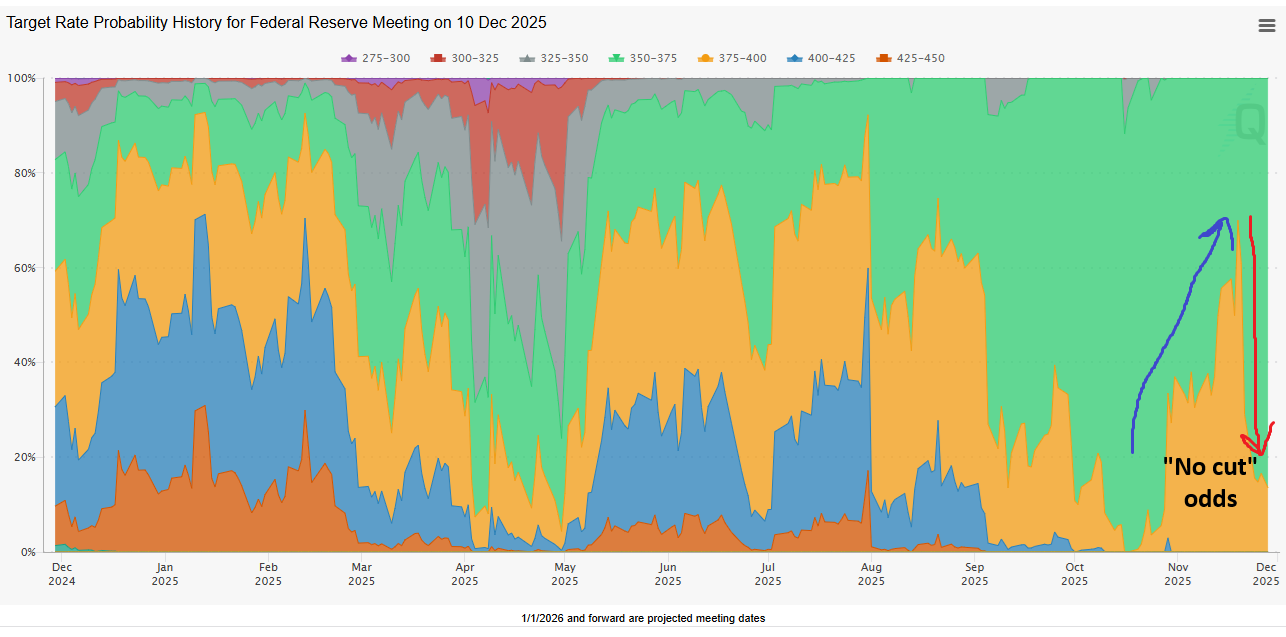 While we were away, the daily parade of Fed speakers did an about-face, sending the odds of a December cut from around 30%, up to 86% today.