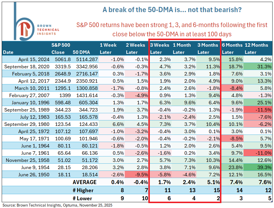 Historically, now is when things begin to stabilize, though of course, we turned around much quicker this time, with the S&P putting in its closing low just three days after the 50-day break (Thursday, November 20) and its intraday low one day after that.