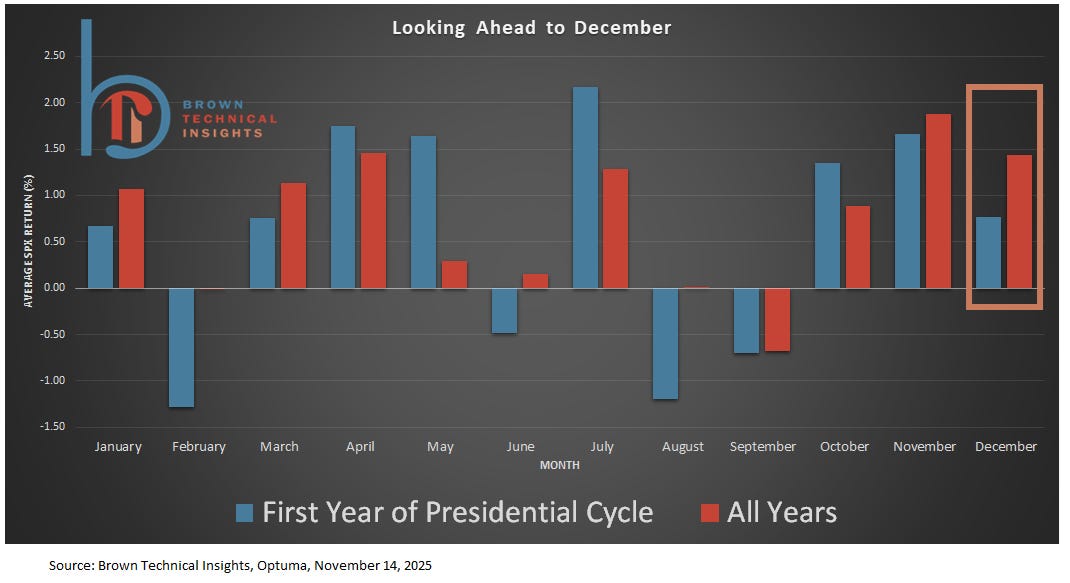 December is a bullish month in general, with a 1.4% gain on average since 1950, though that drops to +0.76% in Year 1 of the Presidential Cycle. More recently, December has been mixed, falling in 3 out of the past 8 years and averaging a 0.3% decline over that time.