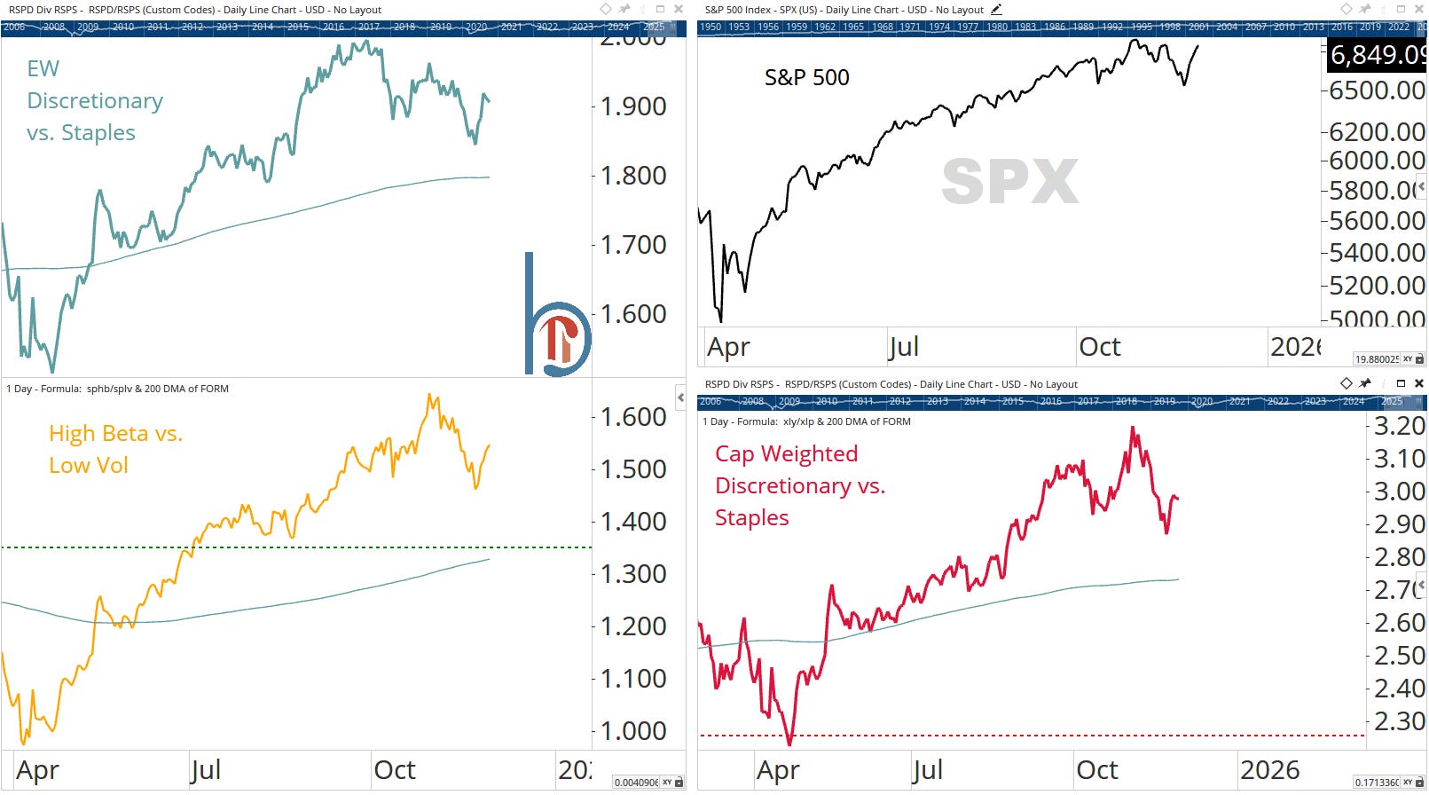 More important than any level on the S&P 500 is what has been the character of the rally? And for the bulls, there is nothing to report but good news. Small caps, high beta, and equal-weight discretionary are atop our risk barometer scoreboard, while the S&B 20 Defensives basket, low volatility, and consumer staples have lagged the most.