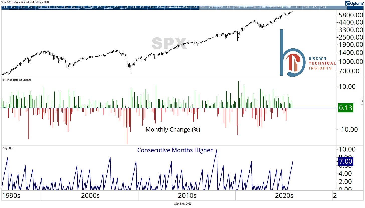 The S&P 500 miraculously ended November higher, gaining 0.13%. That saved and extended the index’s monthly winning streak to 7, the longest since one that ended in August 2021. If we can gain ground in December, it would be the longest monthly winning streak since 10 from April 2017 to January 2018.