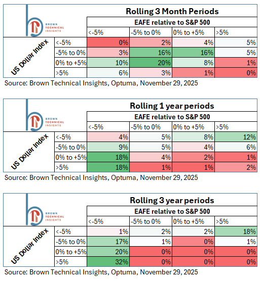 For some background, the study above was in response to a Mailtime question, but I wanted to save it for this report. Essentially, the question was: Are there any time periods where the dollar has strengthened and international equities have outperformed?
