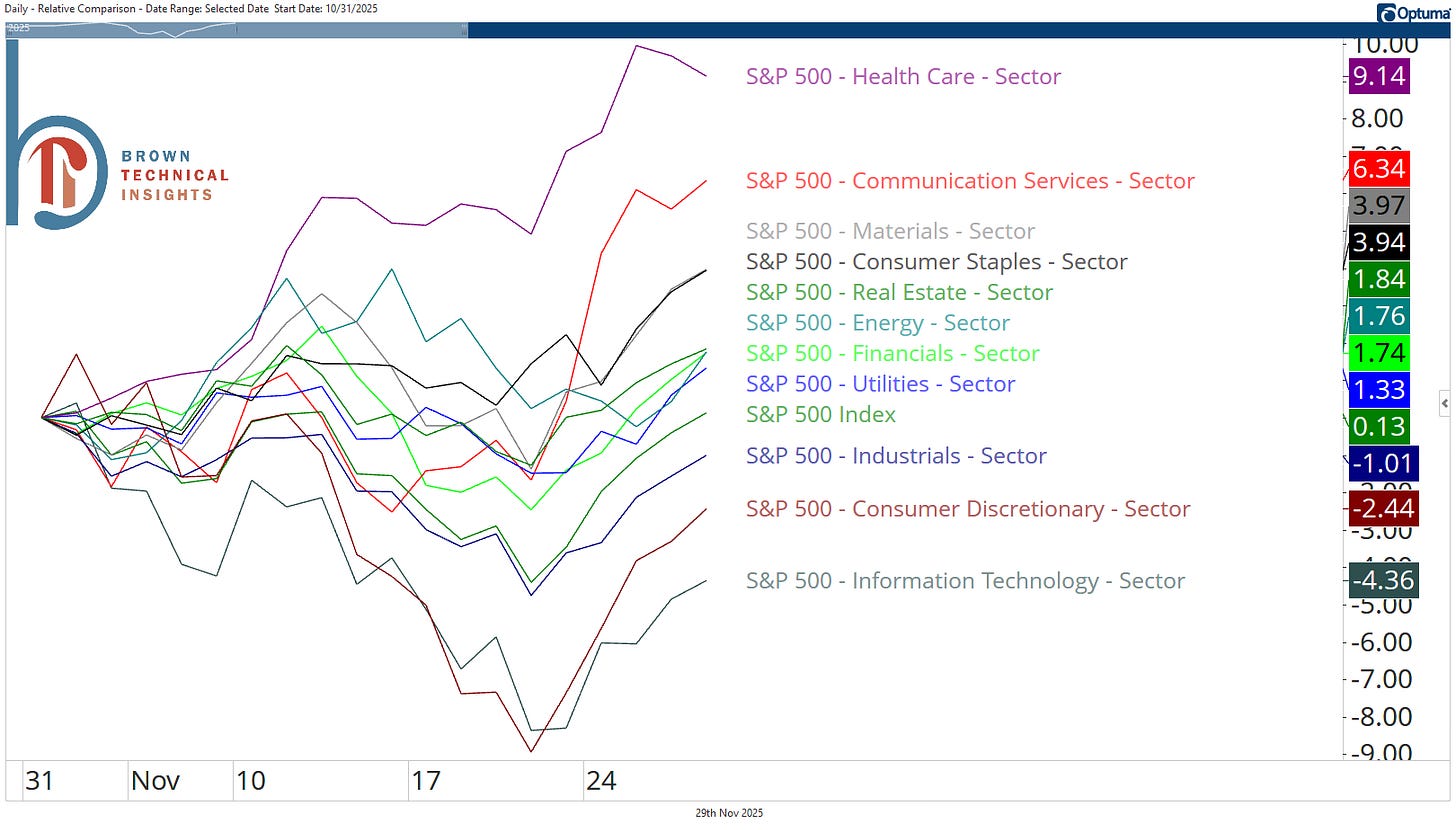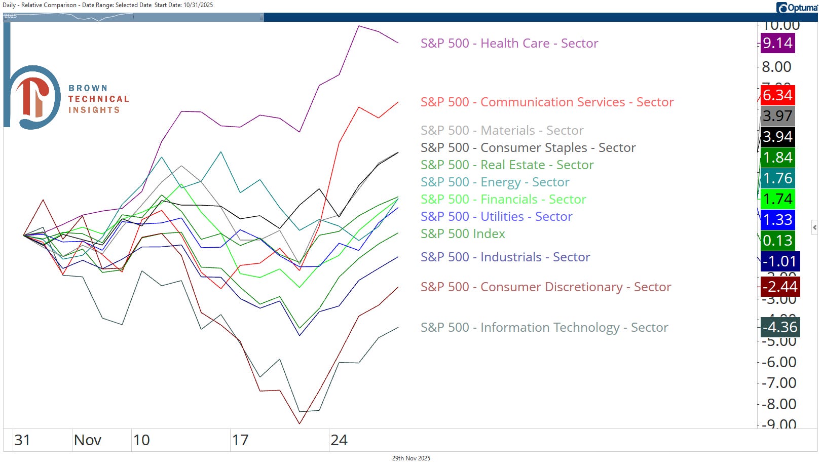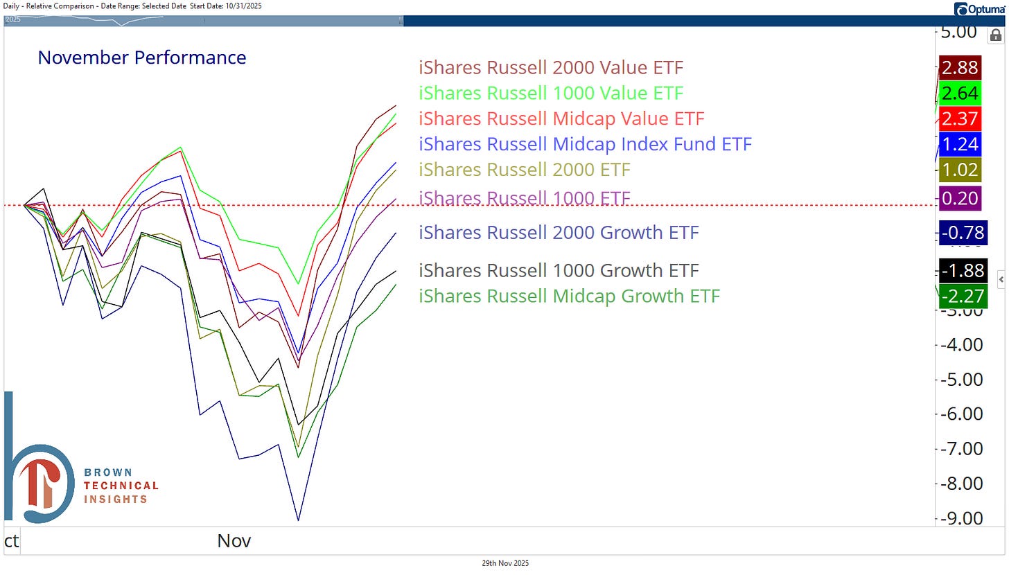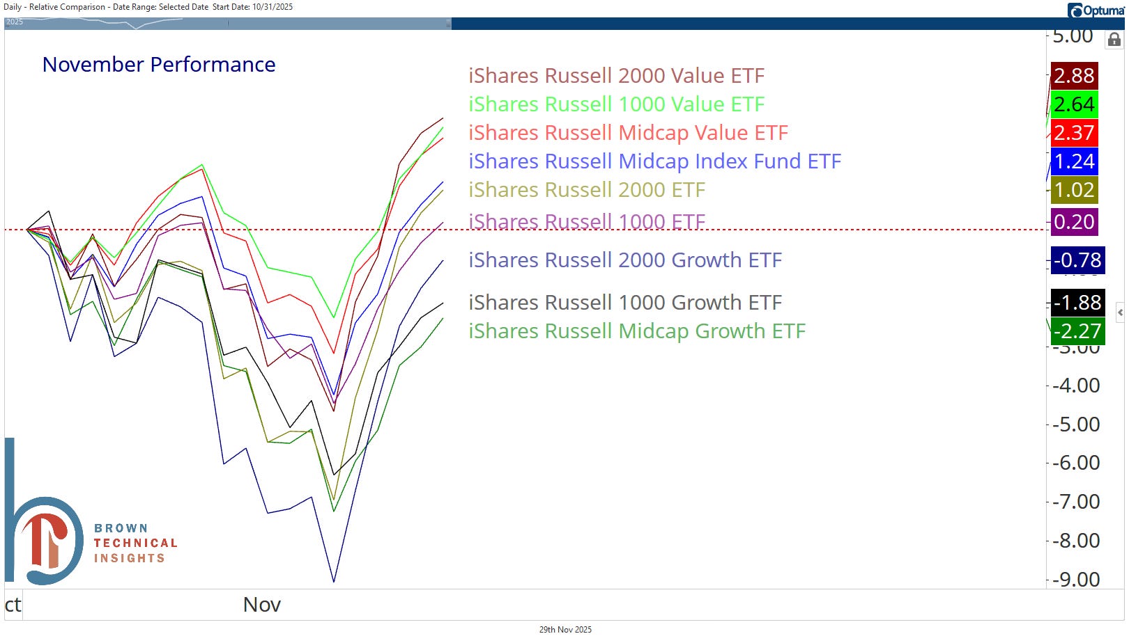 These are the three most important charts we’ll be watching in December. It’s not about whether the S&P 500 or one of these makes a new high first. It’s about do they continue higher (assuming the index does) or do they roll over? The S&B 20 risk ratios will also be telling.