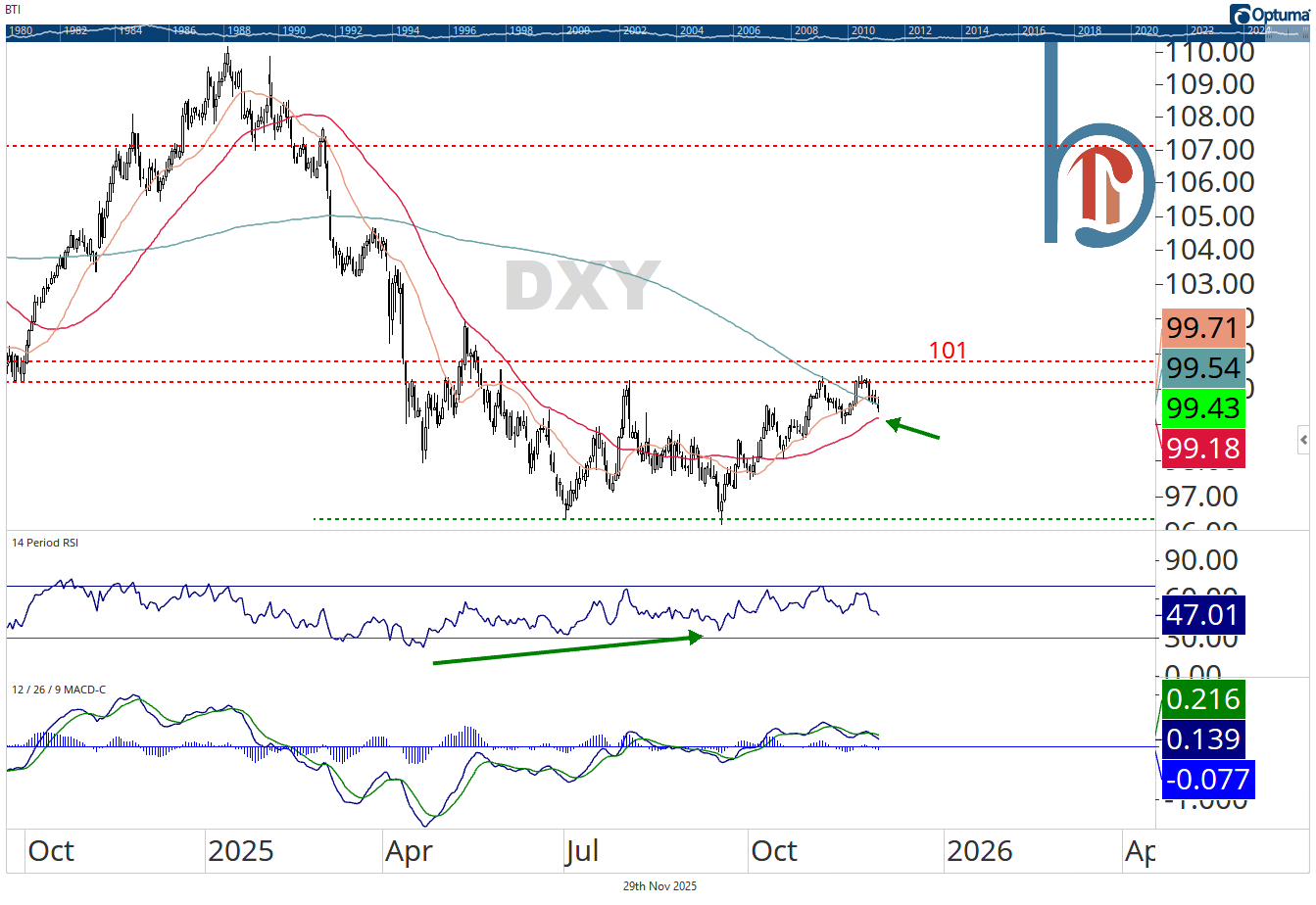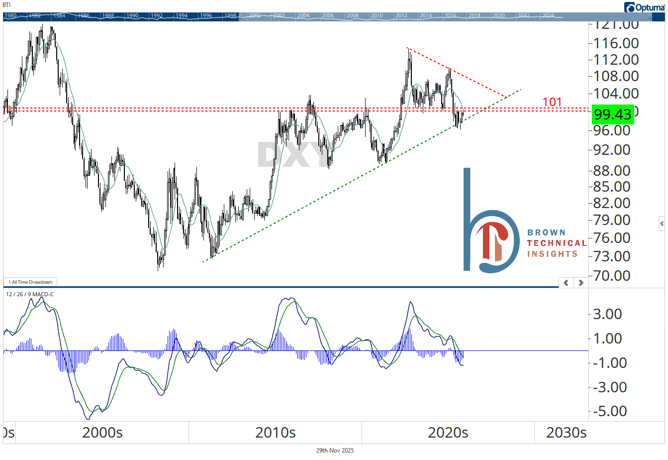 DXY held support while we were away, but failed again at 101. Ultimately, which direction this 5-point box (96-101) resolves is hugely important to the long-term chart 👇