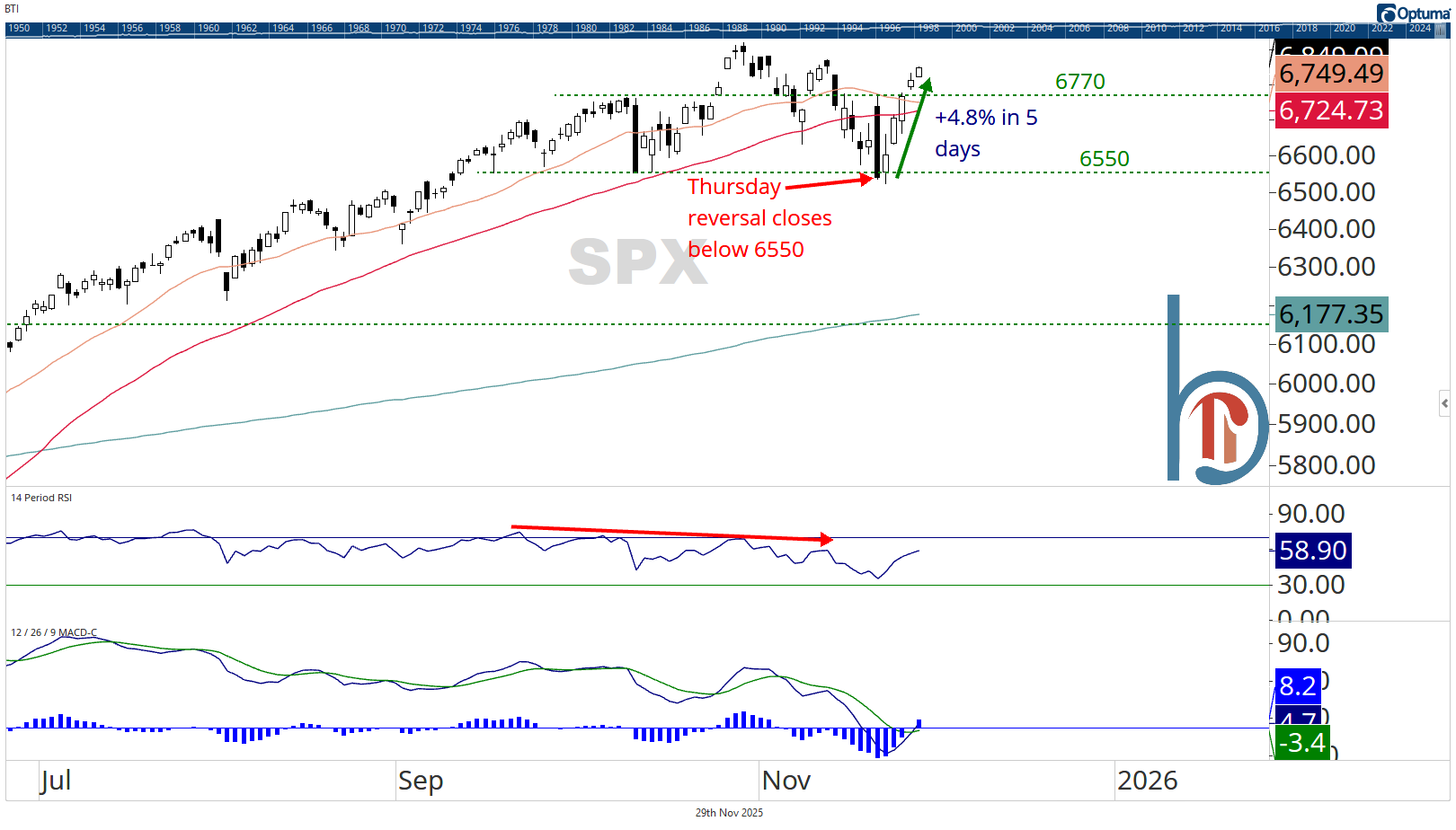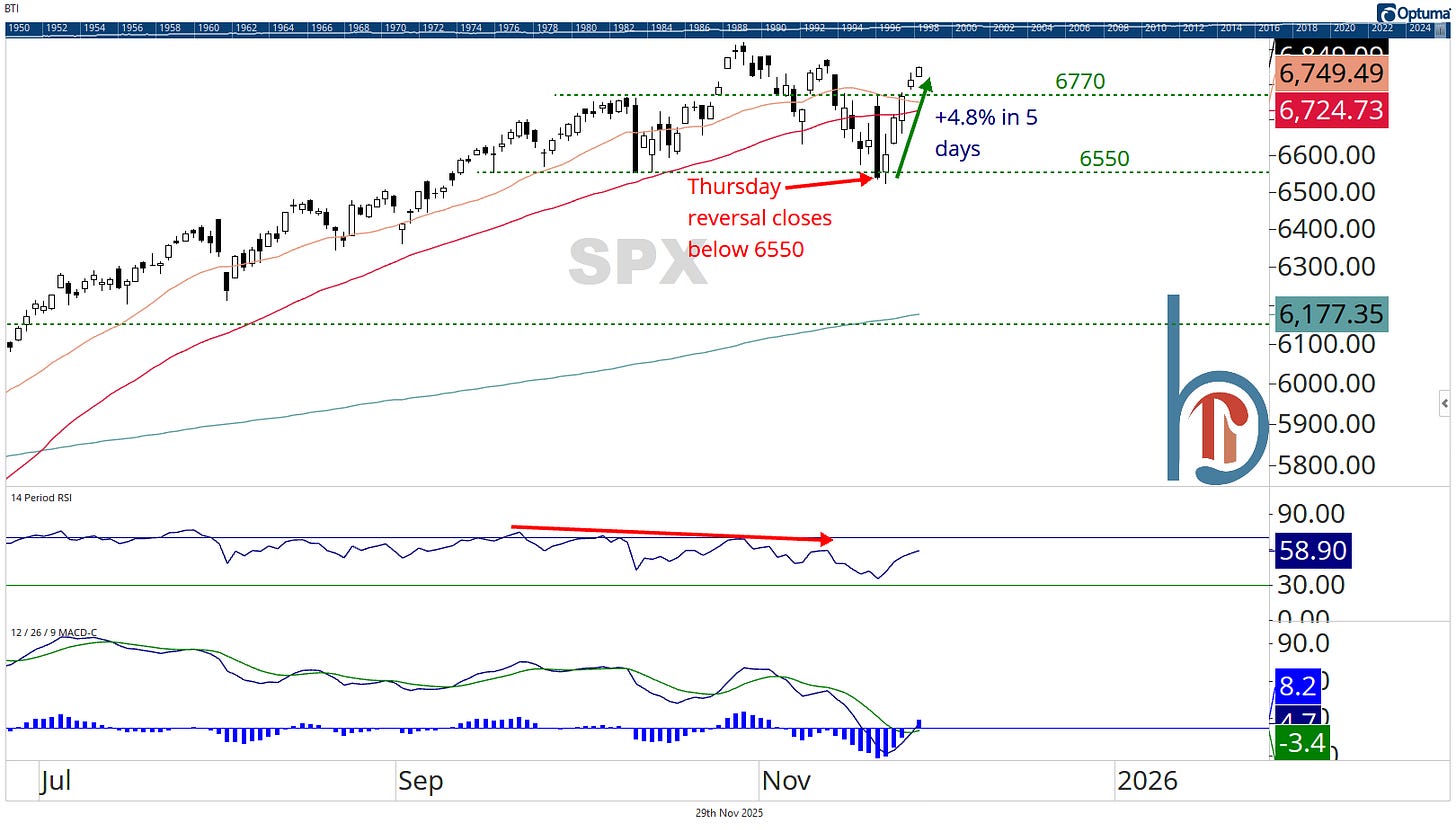 Our last publication came out on the prior Thursday, a day that marked a historic reversal for the S&P 500. The index opened higher by +1.5%, but closed lower by -1.5%, something only seen twice before in history, both in October 2008. The break of 6550 didn’t last, though, and SPX has soared to five straight daily gains and a +4.8% advance in the five trading days since.