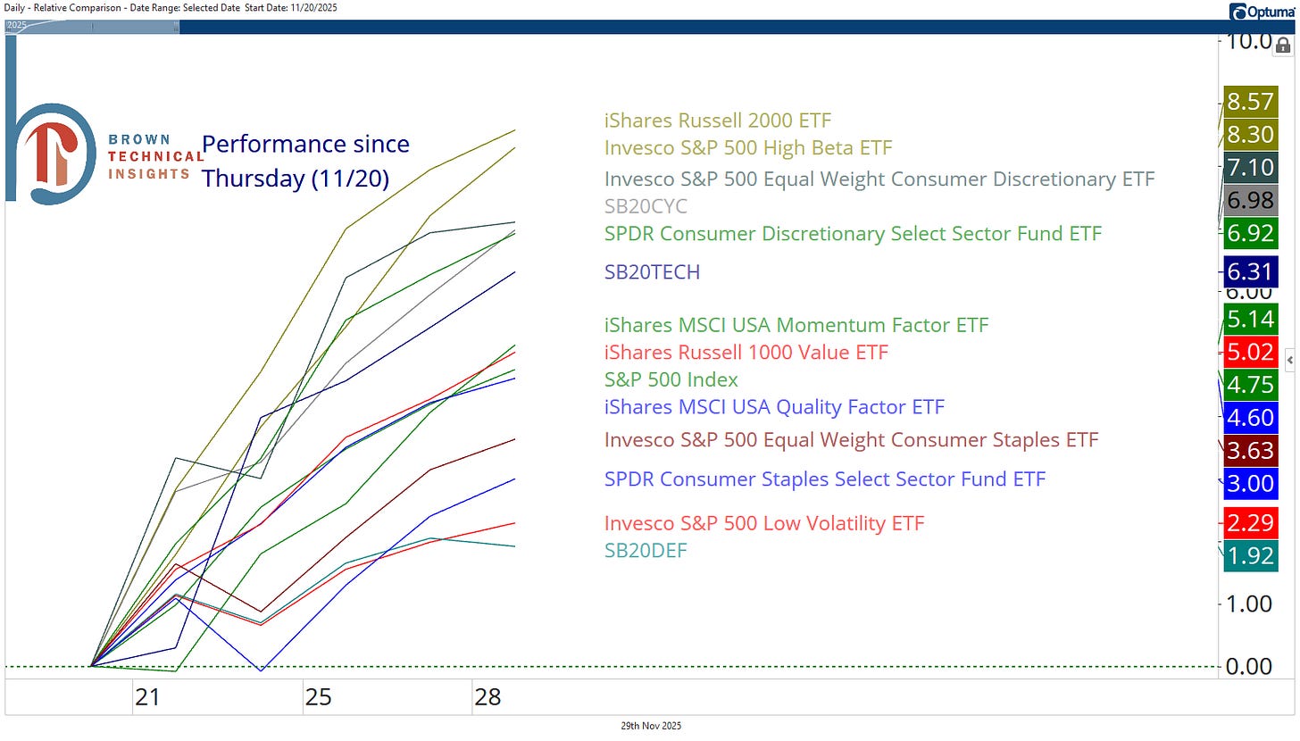 Last week: Stocks soared in the holiday-shortened week, with the S&P 500 gaining 3.7%, its best week since May. Consumer discretionary (+4.9%) and technology (+3.6%) led on a sector basis, while small caps (Russell 2000 +5.6%) outperformed large. The dollar fell nearly 1%, gold gained 3.6%, bond prices were slightly higher, and energy (+1.2%) was the worst-performing sector.