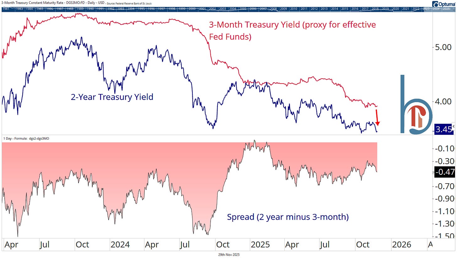 The 2-year yield is approximately 50 bps below the effective Fed funds rate and clearly trending lower. It ended last week just 4 basis points above its October lows, which were the lowest level since August 2022.