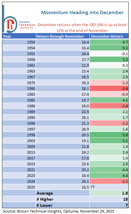 The S&P 500 is up 16.5% YTD. Above are the 25 times when the index has been up at least 15% through the end of November. Bulls couldn’t deliver last year, but December has gained in 9 of the past 10 scenarios and delivered an average 1.8% gain since 1950.